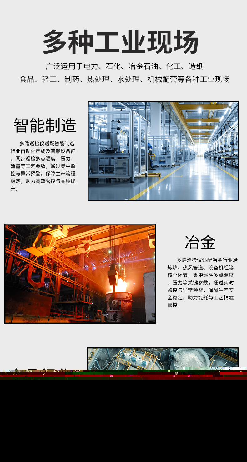 虹潤公司是專業(yè)生產多路溫度巡檢儀的國家專精特新“小巨人”企業(yè),生產的多路巡檢儀,具有8路/16路測量通道,全切換信號輸入,多種輸出類型,高抗干擾,RS485/RS232通訊等特點。產品獲得巡回檢測顯示方法及裝置、儀表殼體等2項國家發(fā)明專利,主持起草工業(yè)過程控制系統(tǒng)用模擬輸入兩位或多位輸出儀表、物聯(lián)網智能溫度儀表通用技術條件等2項國家標準,參與國際5G標準制定,取得多回路測量顯示控制儀等3項相關軟件著作權。產品廣泛應用于電力、石化、冶金、制藥、水處理、機械配套等各種工業(yè)現(xiàn)場。