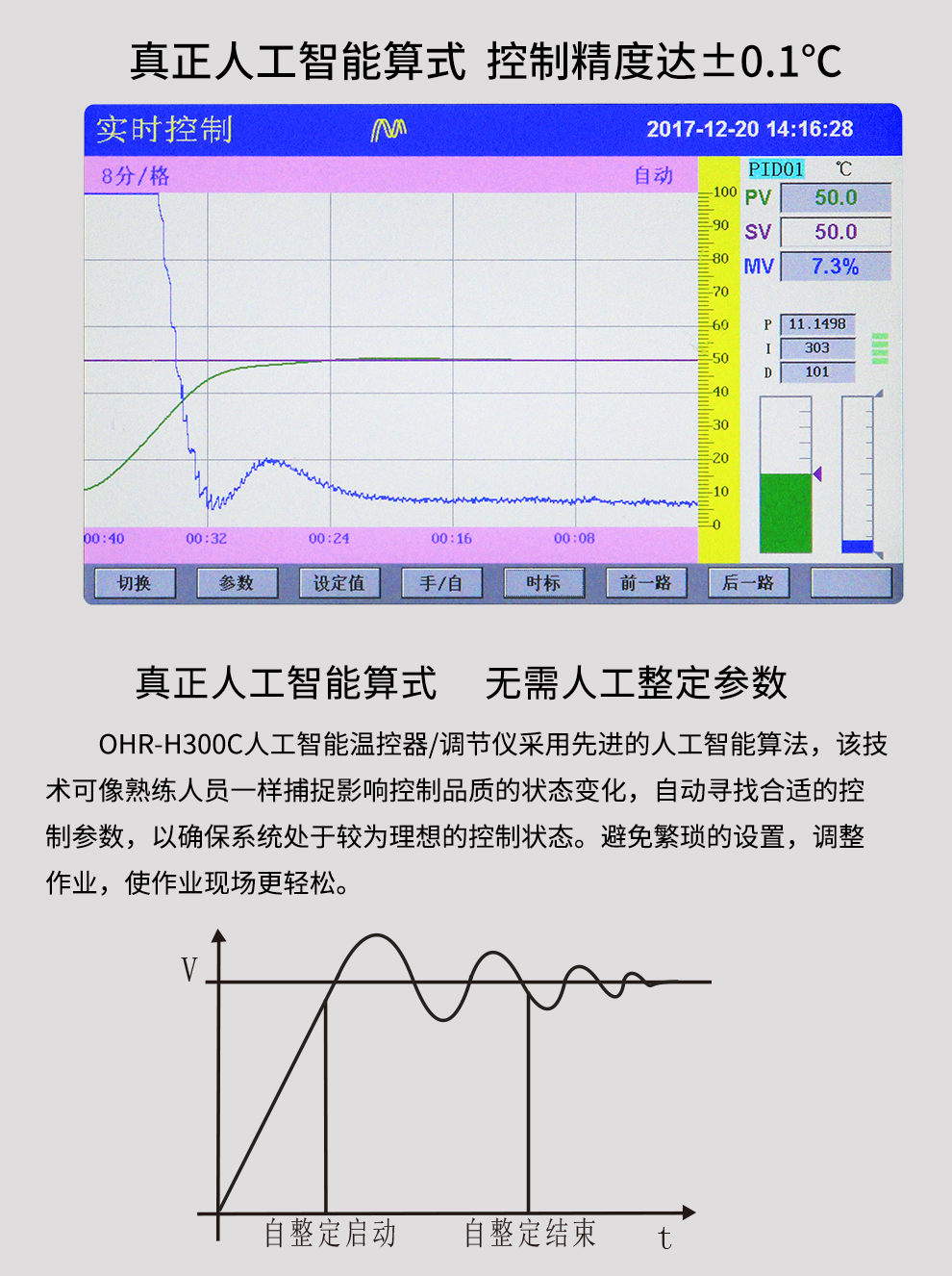 OHR-H300C系列觸摸式溫控器采用真正的人工智能算式,儀表啟動自整定功能,可以根據被控對象的特性,自動尋找最優參數以達到很好的控制效果,無需人工整定參數。控溫精度基本達±0.1℃,無超調、欠調,達國際先進水平。24路萬能輸入(可組態選擇輸入:標準電壓、標準電流、熱電偶、熱電阻、毫伏等)其中可帶8路控制輸入。