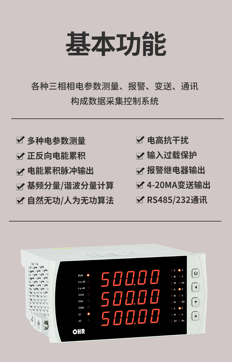OHR-C300系列三相綜合電量表采用大規模集成電路和高亮度長壽命的LED顯示器,應用數字采樣技術,對三相電氣線路中的相電壓、線電壓、相電流、線電流、有功功率、無功功率、視在功率、頻率、功率因數、等進行實時測量顯示與控制。
