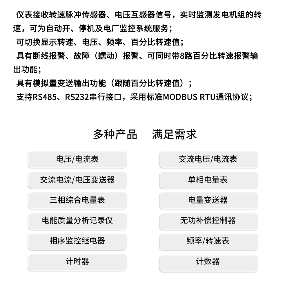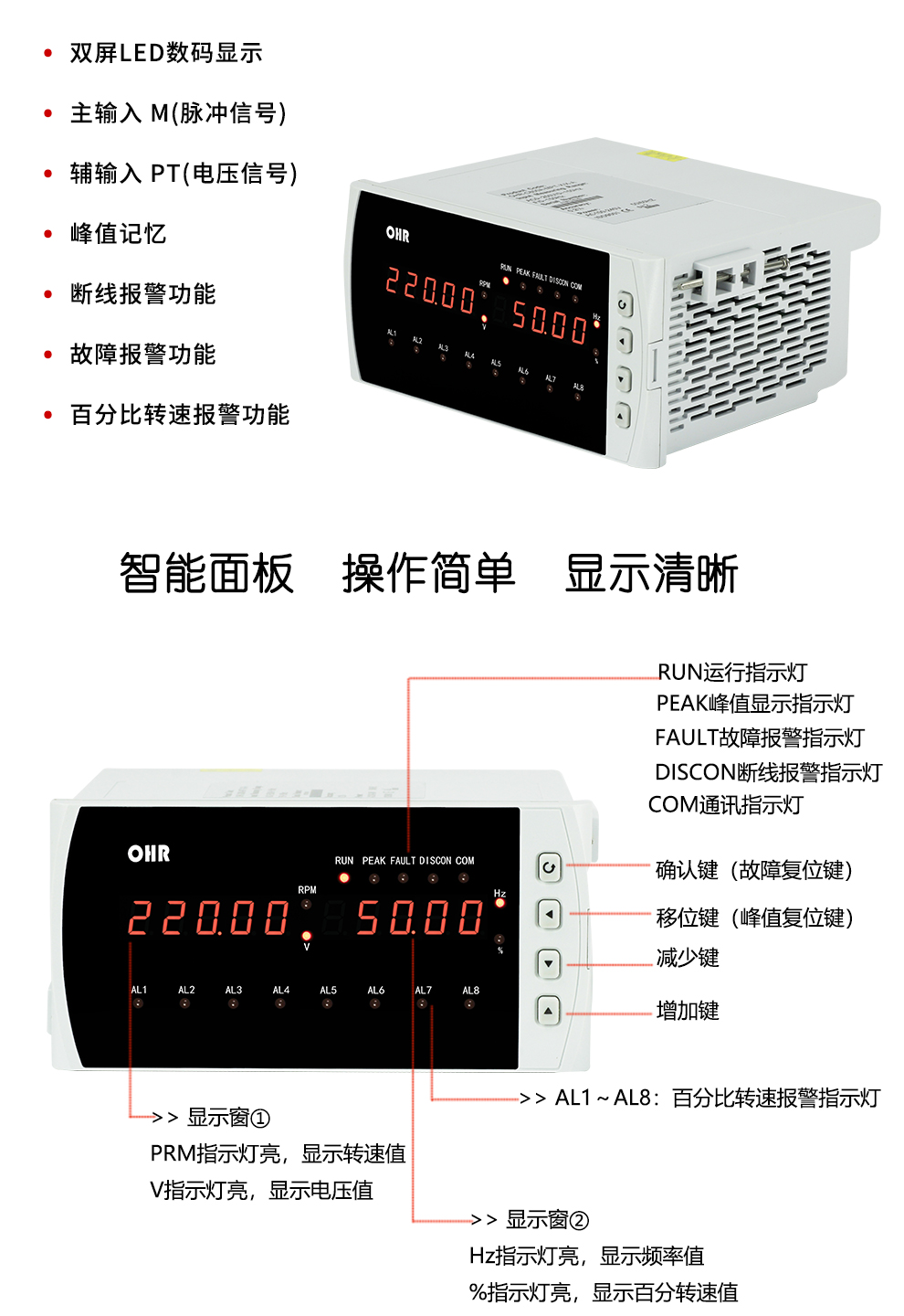 OHR-C800系列電廠專用轉速表適用于測量發電機組轉速,儀表雙屏顯示轉速、電壓、頻率、百分比轉速,有峰值記憶顯示、斷線報警、故障(蠕動)報警、8路繼電器跟隨百分比轉速輸出、模擬量變送輸出、RS232/485通訊接口等功能。