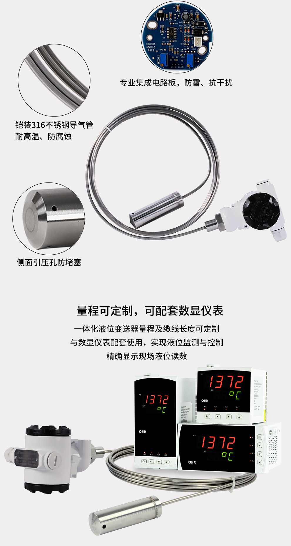 OHR-L2系列鎧裝投入式液位變送器使用進口高精度、高穩定性擴散硅壓力敏感芯片,通過高可靠性的放大電路,將被測液體的液位信號轉換成4~20mA DC標準信號。