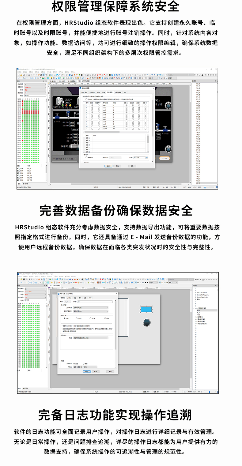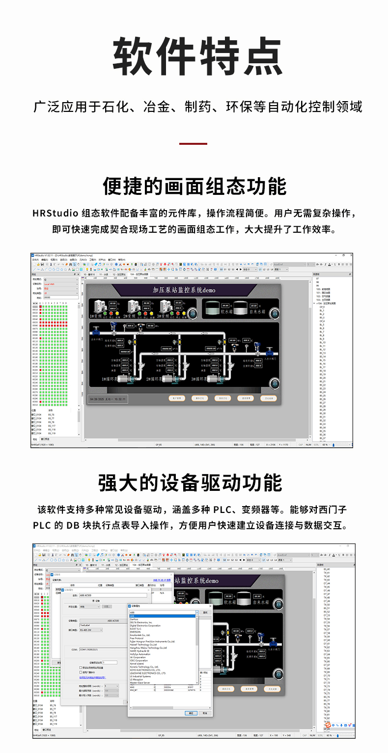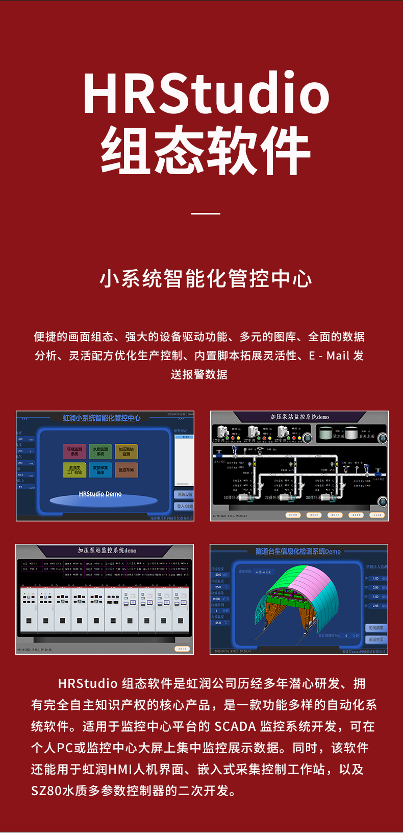 虹潤(rùn)公司是專業(yè)研發(fā)組態(tài)軟件的國(guó)家專精特新“小巨人”企業(yè)。開發(fā)的HRStudio組態(tài)軟件,具有便捷組態(tài)畫面,強(qiáng)大設(shè)備驅(qū)動(dòng),多元化的圖庫(kù),數(shù)據(jù)庫(kù)操作,內(nèi)置腳本拓展,權(quán)限管理數(shù)據(jù)備份等特點(diǎn)。產(chǎn)品獲得嵌入式數(shù)據(jù)采集工作站組網(wǎng)系統(tǒng)等1項(xiàng)國(guó)家發(fā)明專利,主持起草通信系統(tǒng)多通道數(shù)據(jù)采集控制終端規(guī)范軍用標(biāo)準(zhǔn),空間數(shù)據(jù)與信息數(shù)據(jù)傳輸系統(tǒng)等2項(xiàng)航天標(biāo)準(zhǔn),以及現(xiàn)場(chǎng)設(shè)備集成等5項(xiàng)智能制造國(guó)家標(biāo)準(zhǔn)。參與國(guó)際5G標(biāo)準(zhǔn)制定,取得HRStudio 畫面組態(tài) 等1項(xiàng)相關(guān)軟件著作權(quán)。產(chǎn)品廣泛應(yīng)用于冶金、石化、制藥、設(shè)備配套、環(huán)境監(jiān)測(cè)、農(nóng)業(yè)、生產(chǎn)過程控制等諸多領(lǐng)域。