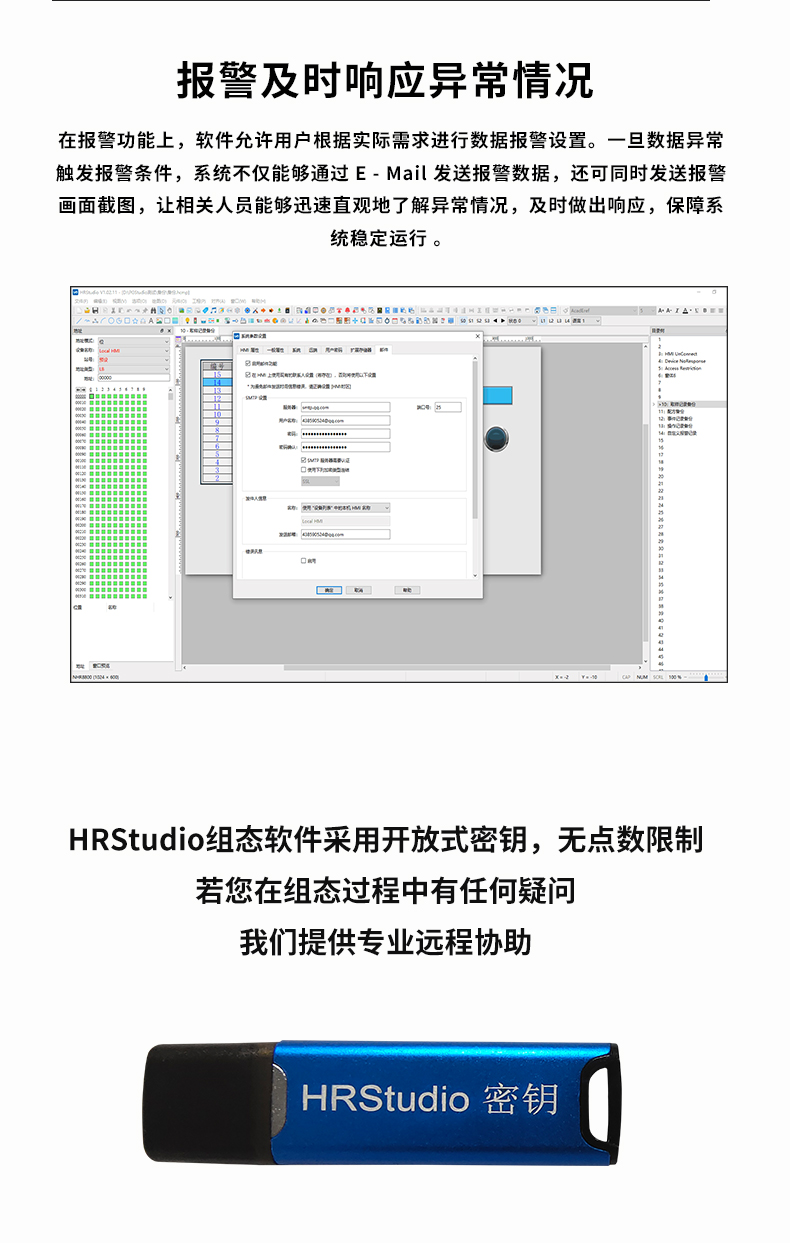 虹潤(rùn)?HRStudio?組態(tài)軟件采用開放式密鑰,無(wú)點(diǎn)數(shù)限制;凡購(gòu)買虹潤(rùn)帶有 RS485/232、以太網(wǎng)通訊功能的儀表,單筆訂單滿 3800 元,即免費(fèi)贈(zèng)送HRStudio 組態(tài)軟件及對(duì)應(yīng)密鑰;若您在組態(tài)過程中有任何疑問,我們提供專業(yè)遠(yuǎn)程協(xié)助。