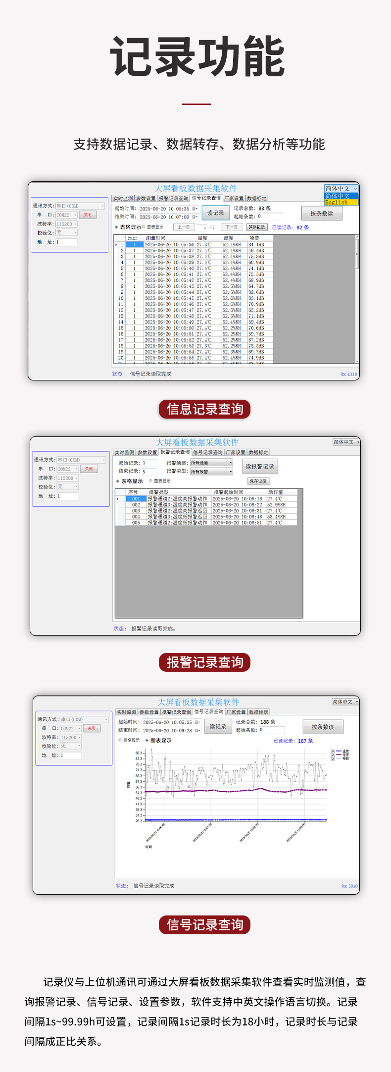 虹潤(rùn)公司是專業(yè)生產(chǎn)環(huán)境監(jiān)測(cè)儀表的國(guó)家專精特新“小巨人”企業(yè)。生產(chǎn)的大屏噪音溫濕度記錄儀,具有高清大屏顯示,數(shù)據(jù)記錄與轉(zhuǎn)存,同步觸發(fā)可靠預(yù)警,RS485或以太網(wǎng)通訊等特點(diǎn)。產(chǎn)品獲得一種手持式低功耗溫濕度檢測(cè)儀、無(wú)紙記錄儀等2項(xiàng)國(guó)家發(fā)明專利,主持起草物聯(lián)網(wǎng)智能溫度儀表通用技術(shù)條件、冷鏈溫度記錄儀等2項(xiàng)國(guó)家標(biāo)準(zhǔn),參與國(guó)際5G標(biāo)準(zhǔn)制定,取得大屏幕溫濕度數(shù)據(jù)記錄儀等3項(xiàng)相關(guān)軟件著作權(quán)。產(chǎn)品廣泛應(yīng)用于電子制造、醫(yī)療科研、倉(cāng)儲(chǔ)管理、畜牧養(yǎng)殖、建筑工程等諸多領(lǐng)域。